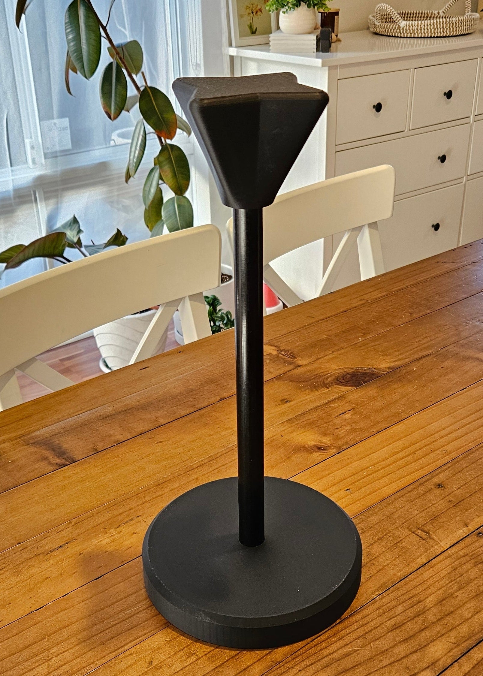 Display your prized helmet collection with this sleek helmet stand, designed for cosplay and collectible helmets from your favorite TV shows and movies. The minimalist black design won't distract from your display, while the 3D-printed matte PLA base pairs with a reinforced acetal rod for exceptional strength and durability. The sturdy 18cm base provides stable support, and the 33cm rod height accommodates most standard helmet sizes. Perfect for showcasing your collection or keeping your cosplay gear organized and ready for the next event.